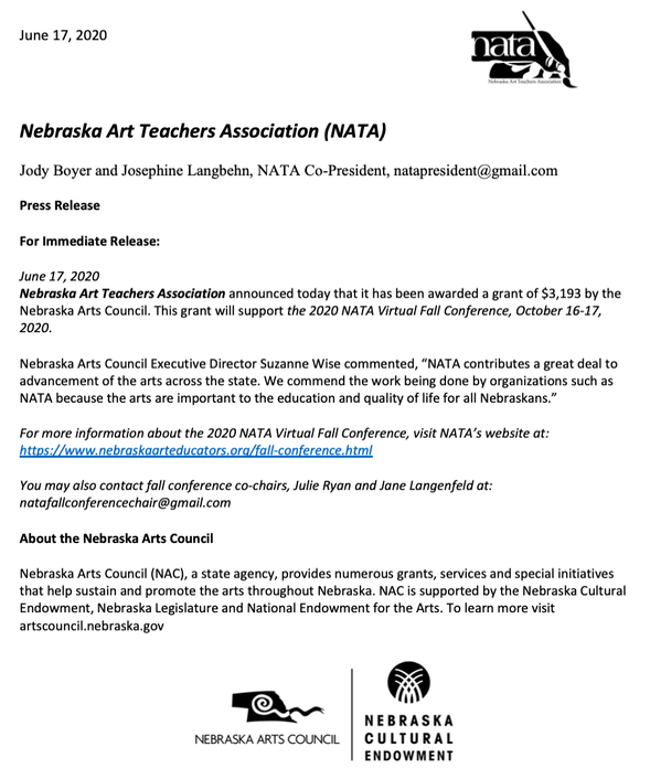 The 2021 NATA Youth Art Month Exhibit and Celebration video is here. Thank you to all Nebraska young artists and art educators for exhibiting. We also appreciate Senator Blood from Omaha and our 2020 NATA Art Educator of the Year, Jane Langenfeld for sharing inspirational messages of advocacy with us. Congratulations to our YAM award winners; they are revealed at the end of the video!